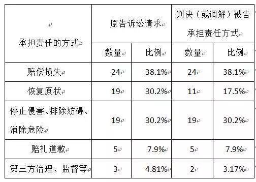 表二 63起环境公益诉讼案件中承担责任方式情况统计表(2015.12016.12)
